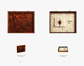 僕のオブジェは壊れていくモノ(死では無く変化)をテーマの一つにしているのですが、普段グラフィックの作業をしている時に、ふと思った事があります。それは印刷物の事で、これは紙の上にインクがのったもの、時にはその上にビニールや金箔がのったりした状態の物の事なのですが、これはそのまま僕のテーマと重なるのではないかと思ったのです。紙は木材などの植物が変化したモノですし、インクは動物や植物、鉱物が変化したモノだからです。そして、それはそのまま僕のBOX ARTとオーバーラップしました。僕のBOX ARTは一番下に箱の部分の木材、次に錆びた道具や化石など、かつて動物や植物、鉱物だったモノがあり、その上にアクリルやガラスの蓋があります。これと同じ構造で本という印刷物のオブジェを作ろうと思ったわけです。